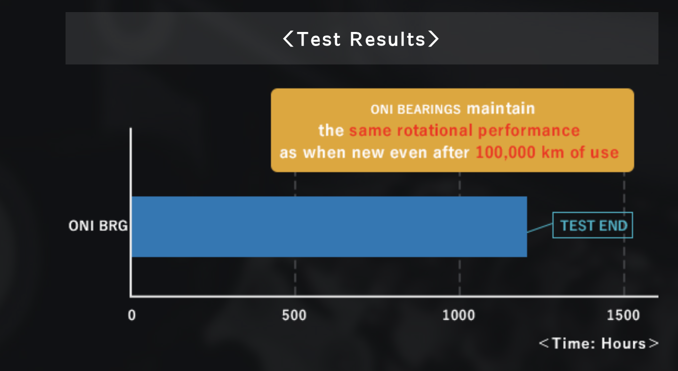 Después de 1,250 horas de uso (aprox. 100,000 km), los ONI BEARINGS mantuvieron el mismo rendimiento de rotación sin desgaste, conservando el mismo nivel de desempeño que un rodamiento nuevo.